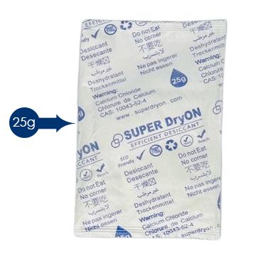 SUPER DryON is specifically designed for application in cartons, boxes, or poly bags. Its inner packing is based on venting packing materials with dual-layer leak-free design features and its outer packing is based on olefins fibers. SUPER DryON is Non-Toxic and DMF free and it turns moisture into a gel, eliminating any possibility of leakage. It is available in 2g, 5g, 10g, 25g, 50g, 100g & 1000g packing variants.